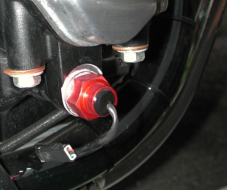 エンジン右側の下の方に、キャップがしてあるオイル通路があるので、キャップをはずして液体ガスケットを薄く塗ったセンサーをつける。センサー取り付けには、付属のOリングとアルミのガスケットの両方を使う。