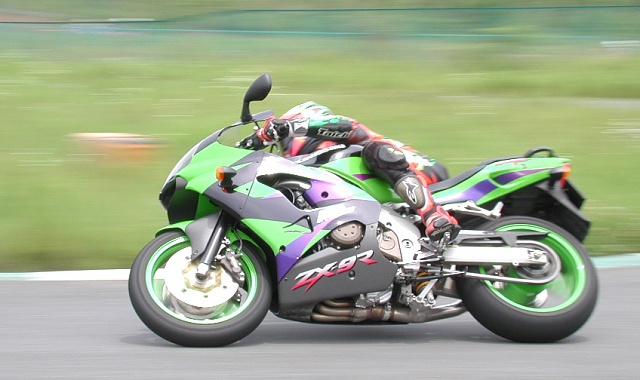 お昼休みに行われた、サーキット走行タイム(自分のバイクを使って)で、ペースカーだったZX-9R。9Rは意外なことにすごく乗りやすいバイクでした。レプリカ買うならこれだぁ!とおもいました。ところでデジカメで流し撮りってできるんですね。以外と良い感じなので驚きました。試乗会が無事終わって、帰ろうとしたら、雨が降り始めた。高速に乗った途端に雨脚は激しく、土砂降り状態。昼休みの走行会には参加できなかったけど、バイクに乗ってこなくて正解だった。