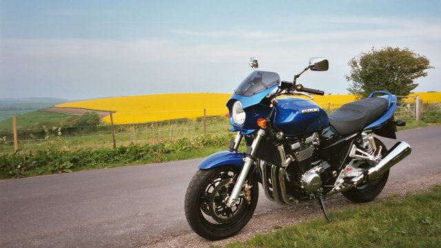 菜の花の黄色とGSXの青が好対照です。あたりまえだけどイングランドでも春が近いんですね。