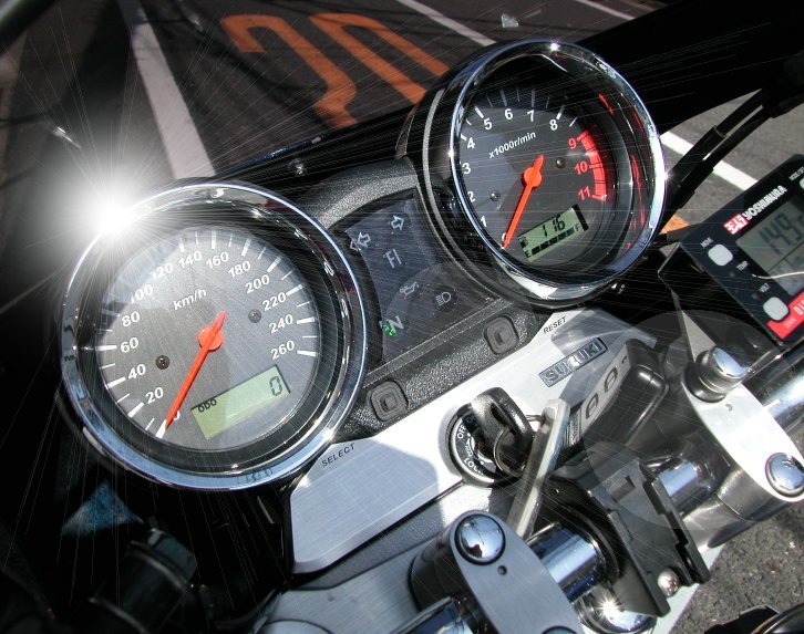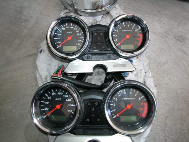 2001年モデル純正の180Km/hフルスケールメーターと、ケイズメーターワークスさんの260Km/hフルスケールメーターを並べてみました。