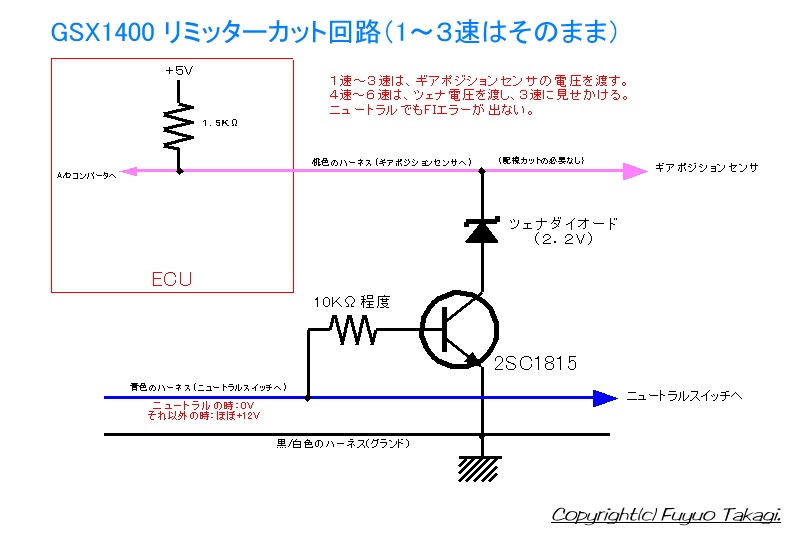 この100円リミッターカットは、GSXメーリングリストのくにさんによるギアポジションセンサ周りの解析結果なくしては作ることはできませんでした。その他の方からも、多くの情報をいただきました。篤くお礼を申し上げます。