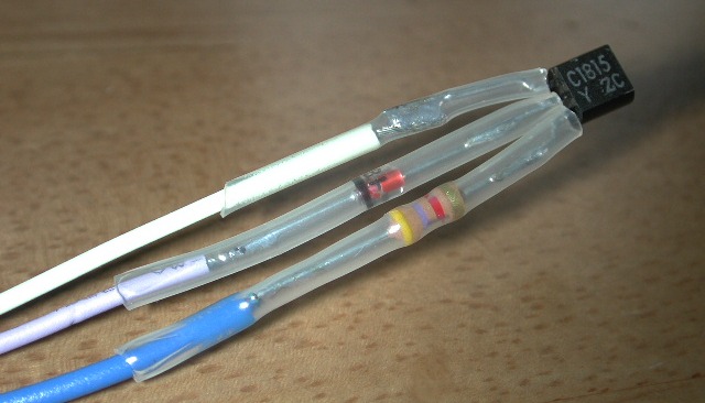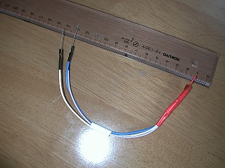 リード線の長さは10cmもあればOKでした。(私のは長すぎです)先端には、切った抵抗の脚を使ってコネクタ差込端子をつくります。長さは10〜12mmぐらいです。