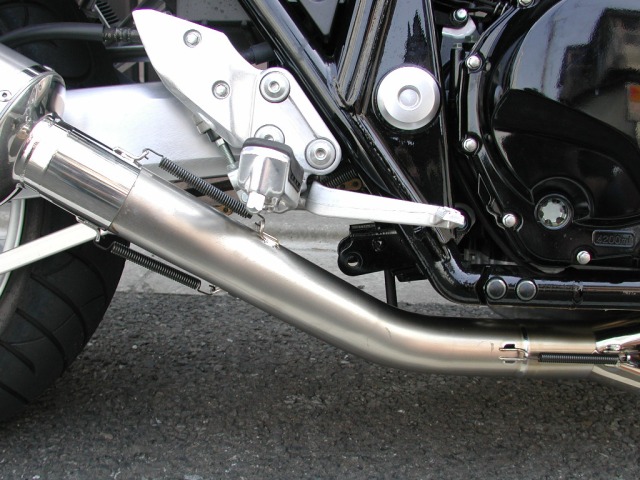 このマフラーには、センタースタンドストッパーが付属するので、センタースタンドがそのまま使えるのですが、ストッパーを取り付けるには一度センタースタンドをはずさなければいけません。で、スタンドをはずしたまでは良かったのですが、スタンドのスプリングが強力すぎてフックに引っかけることがどうしてもできないのです。スプリングフックは持ってますが、全然ダメ。こういうときに便利な特殊工具が世の中にはあるのでしょうか。人間の腕の力ではどうしようもない気がするのですが・・・