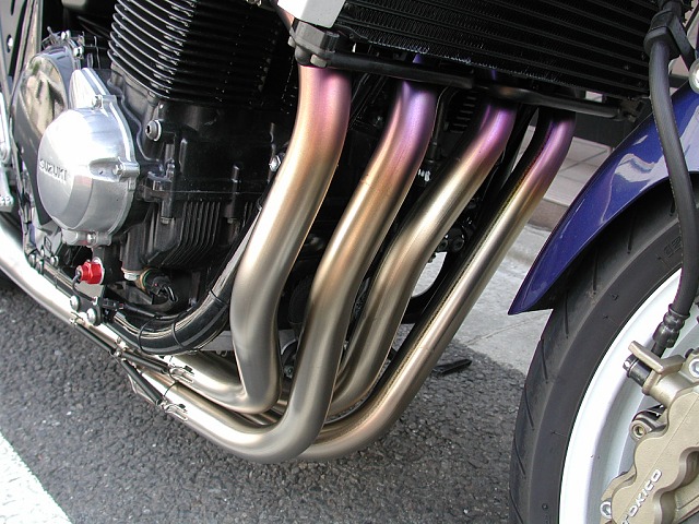 走行100Kmほどで、チタンパイプの高温になる部分の表面が酸化して着色してきます。まず金色になり、ピンクになり、次第にパープルになります。酸化チタンの膜厚の増加に従い、だんだんとグラデーション状に着色が始まっています。きれいに着色するように、取り付け終了後ブレーキクリーナーなどでしっかり脱脂したほうが良いと思います。