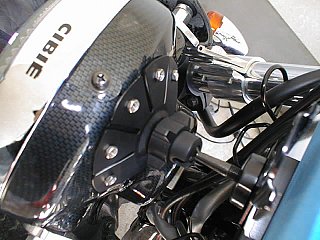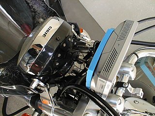 取り付けがうまくいったので、テストを兼ねてツーリングに行ってきました。ここで、問題が発見されました。バイクの振動が本体に伝わって、その振動のためにCD−ROMドライブが正しくCDを読み取れないのです。何度もリトライをしているようですが、うまくいかず、その間はナビの表示がフリーズしてしまいます。一般道をゆっくり走っている分には大丈夫なのですが、高速道路などはエンジンの回転も高いため読み取りがほとんどできないようです。帰宅後、補助ステ−をつけたり、がっちり取り付けずにわざとネジを少し緩めてブラブラ状態にしたりいろいろ振動を逃がす方法を考えたのですが、どれもうまくいきませんでした。Vエンジンなんで、振動が大きいせいもあるでしょうね。車体にがっちりとリジットに取り付けるようなタイプのナビゲーションはCD−ROMではなくメモリーカードをデータの置き場所にしているものでないとだめみたいです。