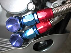写真は、取り付けが完了したところです。ブレーキホースと違って、そんなに高圧がかかるわけではないので、バンジョーなどの締め付けもあんまり神経質にならなくても良さそうです。短いほうのホースが長さぴったりなのに、長いほうのホースが少したるんでいるのは、もしかしたらホースの取り付けが逆のようなきがしませんか?でも、取扱説明書の指定はこうなんですよ。とりあえずこれで不具合はないので、このままでいきたいと思います。