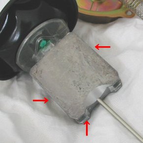 分解の途中で気が付いたのですが、バキュームピストンを調べてみると、ピストンの縁(写真矢印)にバリらしきものがありました。指先でなぞってみるとかすかに引っかかりを感じます。量産品ということで、こんな細かいところまでのチェックは不可能なのでしょうが、CVキャブの一番肝心な部分なだけになんとかして欲しいものです。このバリのせいで、キャブの中で摺動するときにガイドとの摩擦で動きが鈍くなりそうです。これはそのまま放っては置けないでしょう!