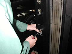 彼に頼み込んでピッキングの方法を教えてもらい、道具を借りて彼の指導のもとで自分の家の錠のピッキングに挑戦してみたところ、なんと、3分もかからずに鍵があいてしまいました。初めてピッキングをやったシロウトでもこんなに簡単に鍵が開いてしまうのはものすごく恐ろしいことです。これはかなりヤバイと思い、その場ですぐにピッキングによる開錠が困難なシリンダーに交換してもらいました。(写真)