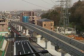 大塚・帝京大学駅 始点より1.7Km、この駅も大学の名前が付いていますが実際には少し駅から離れています。 上の中央大学・明星大学駅からこの駅の間は57.5‰(パーミル)と言う多摩モノレールで一番の急勾配が有ります。 ゴムタイヤなので苦もなく上り下りしてしまいますが、車でもキツイ勾配ですね。 (57.5‰(パーミル)とは1000m走行すると57.5m登る又は下る勾配です、57.5/1000と表記する事も。) ただ、この勾配が降雪時にはネックとなり運休してしまう事もあります。 左下の画像は大塚・帝京大学駅と松が谷間を中央大学・明星大学駅に向かって撮影した物。 大塚・帝京大学駅は共に勾配を下りきった所に有り、列車は大塚・帝京大学駅を発車すると中央大学・明星大学駅に向けて上り勾配に。 |