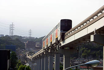 中央大学・明星大学駅 始点から2.6Km、動物園駅からの上り勾配を登り切り、多摩モノレールで唯一のトンネル(200m)をくぐり少し下った所に有ります。 駅名の通り2つの大学の間に有り専用の連絡通路も、ホームで列車を待つ乗客も若い学生さんばかり・・。 ここの駅の特徴は駅のデザインも独特(画像上)、構造もこの駅だけは特別でしかも多摩モノレールの駅名で一番長い駅です。 他の駅の構造はホームの下の階に改札口が有り階段、エスカレーターやエレベーターでホームに上がるのですが、この駅だけはホームの上に改札口が有り、ホームに下りて行く構造です。(橋上駅舎) そのためホームは地下鉄の様な雰囲気があります。(画像中央) また駅の北側(立川寄り)は平行する道路と同じ高さで列車を見ることが出来ます、この様な視点でモノレール車両を見られるのも工場を除いてここだけでは?。(画像下) レールと下回りが見えないと普通の電車に見えてしまいますね。 |