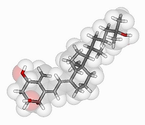 | コレカルシフェロール(D3) | ![]() | 補給の目的には1日400IU。 | ビタミンD欠乏症の予防と治療。経口投与されたD3は吸収されて、肝臓にはこばれ、そこで、一個−OH基が導入され、さらに腎臓でまた−OH基が導入されて、活性型ビタミンD3になる。この活性型ビタミンD3になって初めて種々のカルシウム代謝に関与することになり、これは、ビタミンD2でも同じである。 | ビタミンD過剰症(骨歯異常、興奮、不眠、頭痛、発汗、食欲不振、嘔吐、便秘、下痢、腎障害、多尿、高血圧、皮膚の乾燥、全身倦怠ほか。 | |