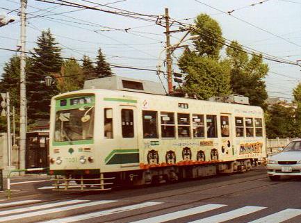 都営バスでは広告車(ラッピングバス)が一種のブームを巻き起こしていますが、都電にも広告車が導入されています。都営バスと比べるとちょっと遠慮がちといったところでしょうか。 (宮ノ前付近) |