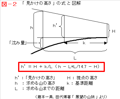 これらを表しているのが 図−2 で、 これは先ほどの 「展望の山旅」 に書かれていたものを少し簡単にしたものである。この 「見かけの高さ」 が、富士山と大山の場合どうなるのかを、「地球の丸さによる沈み」 と 「気差」 を考慮して計算する式が 図−2 の下に書いてある式で、 「沈み量」 は地球の半径 6,370km を 「気差」 による補正により 7,360km に拡大して計算して求めているのだそうである (「沈み量」 は 図の式の 「L*L(Lの2乗)/14.7」)。