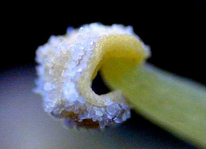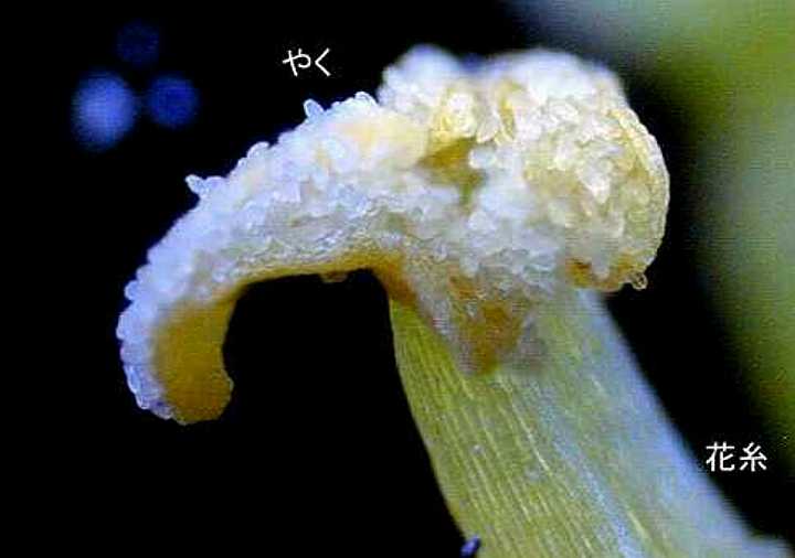 丸まっている葯が多いですね。どうしてかな? 花糸のつきかたを見てみましょう。 はっきり見ることはできませんが、葯のはじの方に花糸がついていますね。 花糸の先の部分の両側に葯室がついていることになります。 このようなつき方の葯を 一番多いタイプです。 |