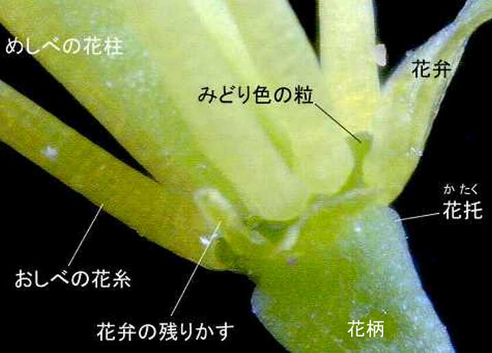 花の内部を観察しやすいように、がく片と花弁を取りのぞきました。花弁のカスが少し残ってしまいました。 おしべは、花托につくものや花弁につくものがあります。 おしべのねもとの方を観察してみると おしべは、花弁についていません。 おしべの内側になにやらみどり色のつぶが見えます。なんでしょう? |