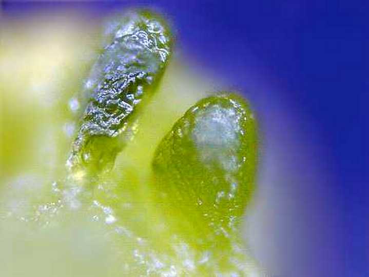 イヌガラシのおしべです。 おしべは、棒状の 葯は、花粉をつくるところで、2つの葯室からできています。 写真では、葯室がたてにさけて花粉をはきだしています。 このようなさけ方の葯を |