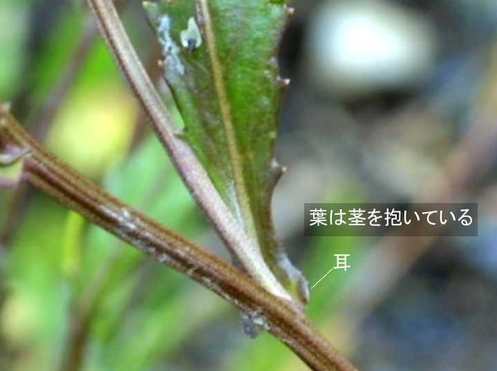 中央の その終わりのところには、ほんのちょっと小さな耳たぶのように葉がつきだして、茎をだいています。 つきだしている部分を、植物用語では、ほんとうに、耳と呼んでいるんです。 |