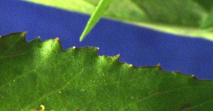 イヌガラシの葉のきょ歯は、たいていは、ふぞろいになっています。 のこぎりの歯のようにきれいにそろっていません。 ほかの植物のギザギザと、ちょっと感じがちがいますね。 きょ歯の部分を、もっと観察してみましょう。 |