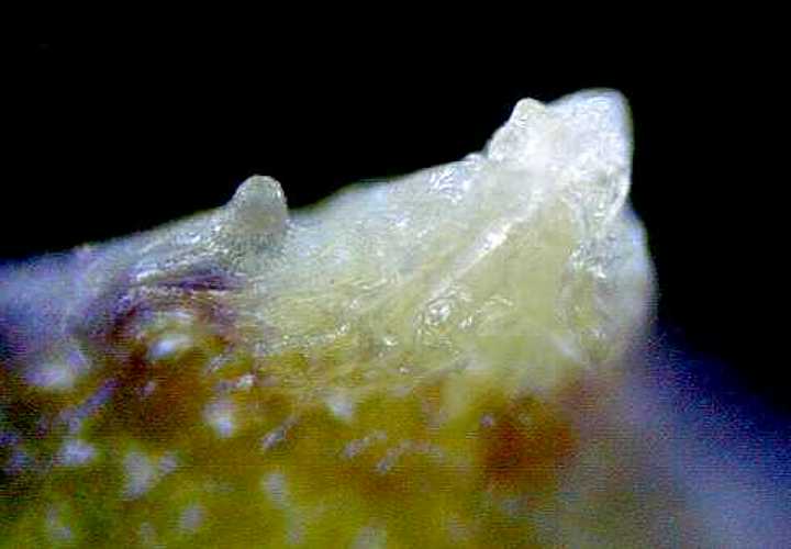 たしかに、ふぞろいのきょ歯です。 よく見ると、きょ歯の先の部分が白っぽくなっています。 単なるギザギザではなさそうです。 トゲのようにも見えます。 |