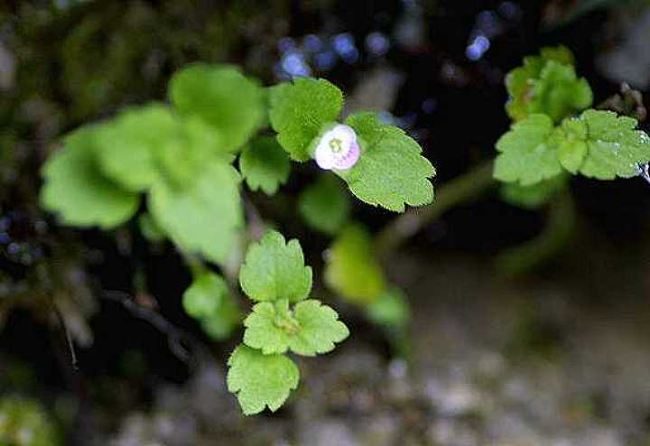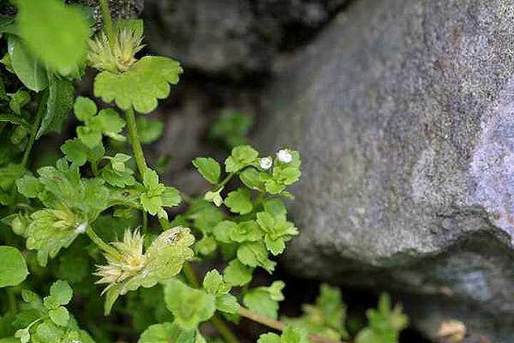 葉の ふだん見なれているオオイヌノフグリとは、ずいぶん感じがちがいます。 よく見ないと見のがしてしまうほど小さいからでしょうか。 農家のおばちゃんたちのお話では、石垣に咲いていたこの花の名前は知らなかったとのこと。ある人に、めずらしい花だから除草剤なんかまかないようにいわれたそうです。 |