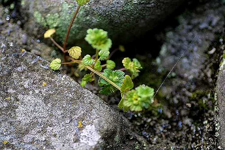 石垣のすき間に生えていました。 イヌノフグリは、直射日光の好きな植物ですが、とても小さく地面をはうようにのびていくので、他の草の陰になりやすいのです。 乾燥しやすいところでも競争相手が少ない石垣は、イヌノフグリにとって楽園なのでしょう。 |