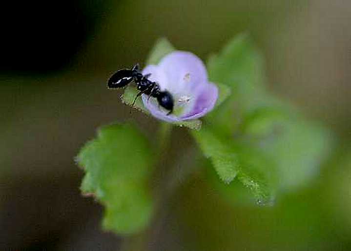 アリさんが来ています。蜜でもなめているんでしょうか。 イヌノフグリの花の大きさをアリの大きさと比べてみましょう。 ずいぶん小さい花ですね。 |