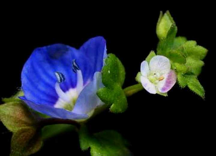 これはいたずらではありません。 花(花冠)の大きさをイメージするために、オオイヌノフグリの花冠を置いて撮影したものです。 これによって、イヌノフグリはホントに小さいということがわかります。 色のちがいもはっきりしました。この写真は、ライトをあててさつえいしたものです。 |