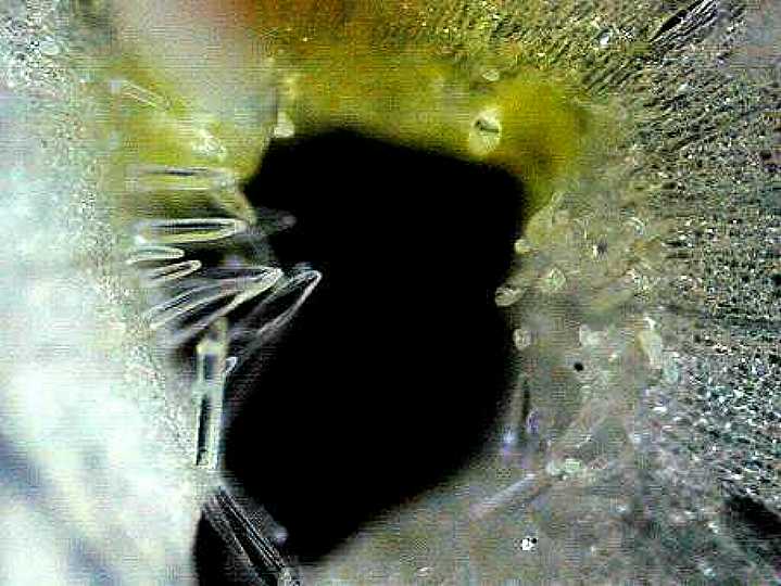 花冠ののどもとには、こまかい 左の突起物は、いくぶん長いので、肉眼では毛のように見えます。 右にも見えますが、みじかいですね。これはたまたま上を向いた角度から見たからで、本当は、左と同じように毛に見えます。 毛が生えているのは、4枚の花弁のうち、両側の2枚です。 |