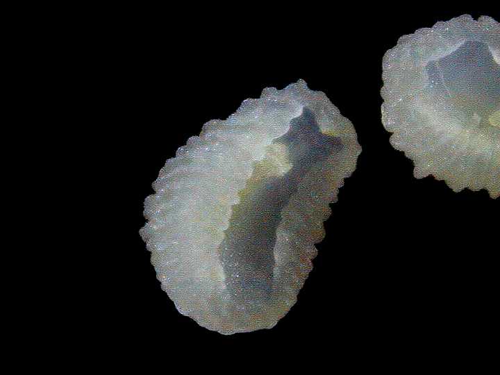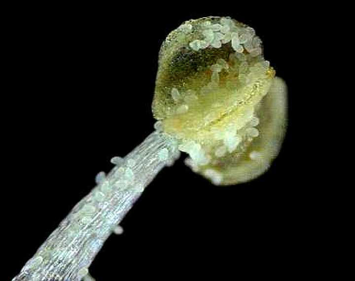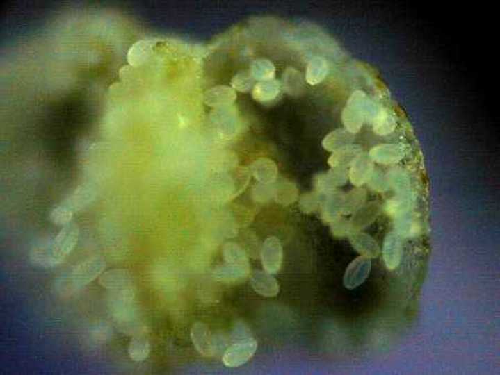 写真は、胚珠を表から見たものです。表面がでこぼこしています。 |