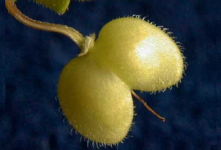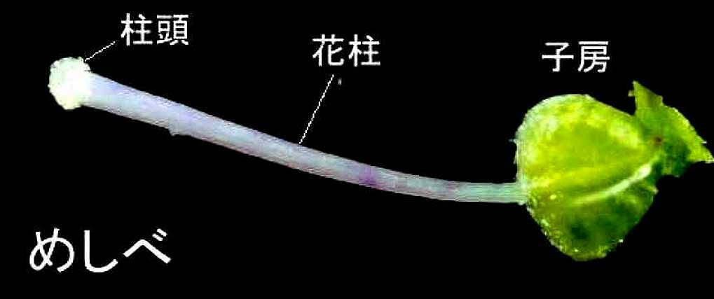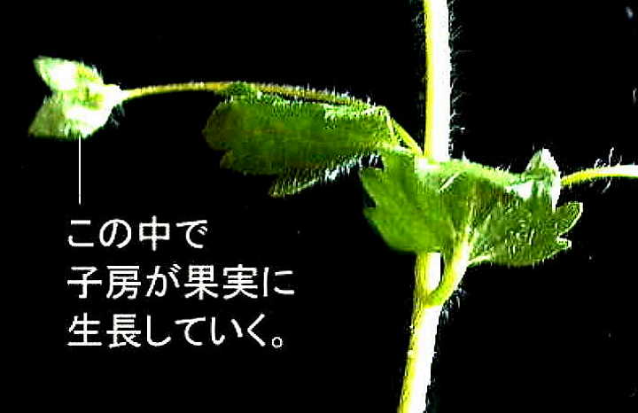 果実の形は、逆ハート形をしており、それがフグリの形に似ているわけです。 左の写真は、 子房が成長すると果実になります。 |