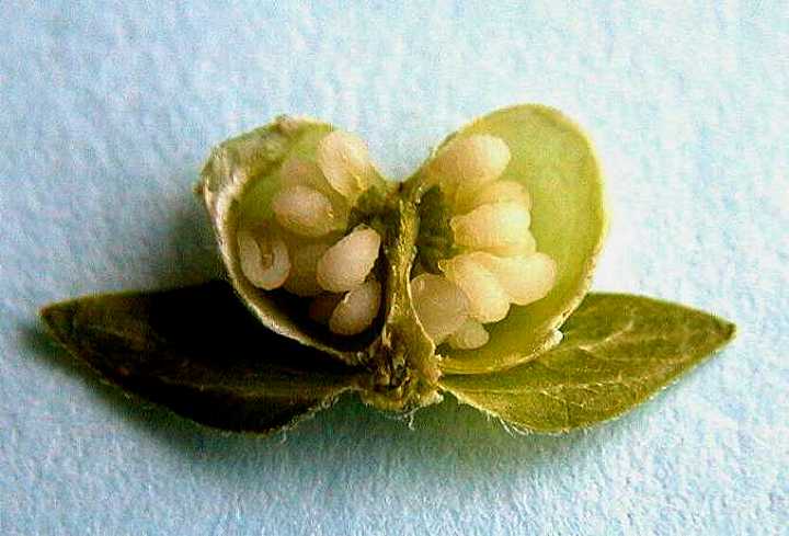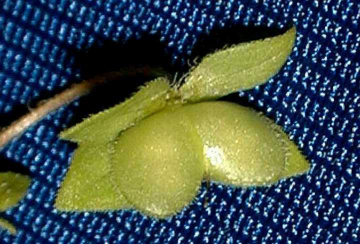 では、なぜ、そのような名前がついたのでしょうか? その理由は、果実の形にあります。 4枚のがく片が左の写真のような形になり、その中で子房が果実に成長していくのです。 |