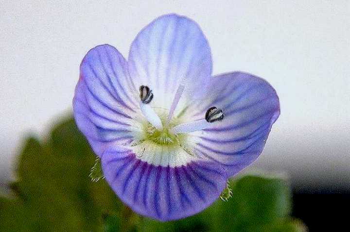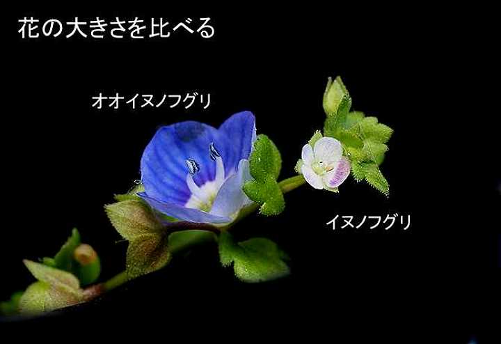 オオイヌノフグリによく似たものにイヌノフグリがあります。花はうすい 比べるためにイヌノフグリの茎にオオイヌノフグリの花をのせてみました。 左の大きなほうがオオイヌノフグリで、小さなほうがイヌノフグリです。 |