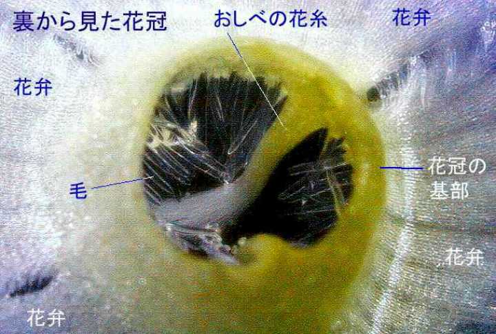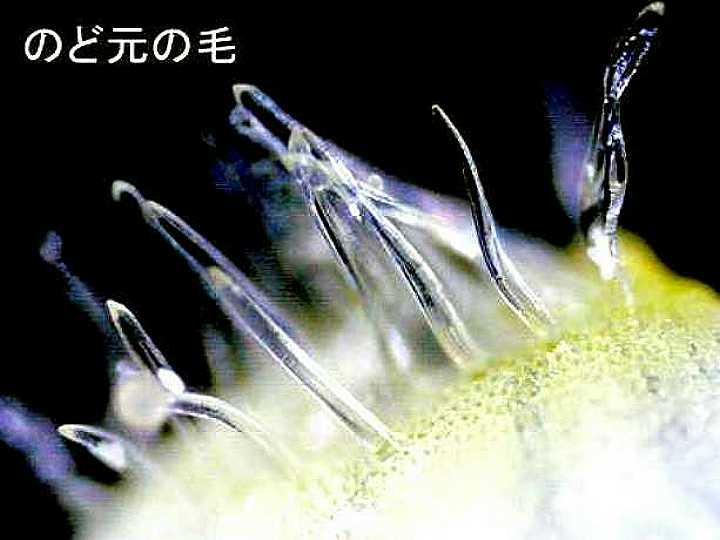 めしべをとりのぞき花冠の基部をアップしてみます。 すごい毛ですね。 この奥には、大切な胚珠をつつんでいる子房があるのです。 子房を食べる害虫が |