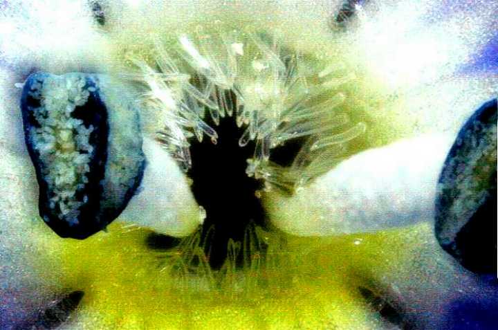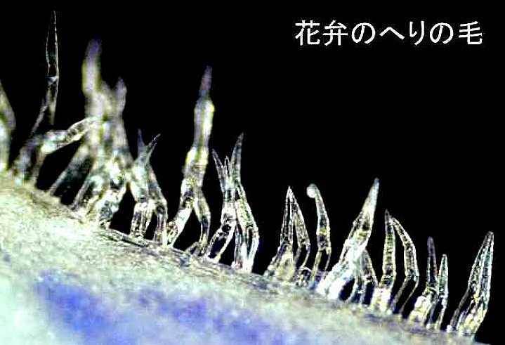 花弁のへりに生えている毛は、短く、顕微鏡で見ると、無色透明なんですね。 氷や水晶のようできれいです。 花弁基部に近いほうにだけ生えているのは、基部の毛と共に昆虫の |