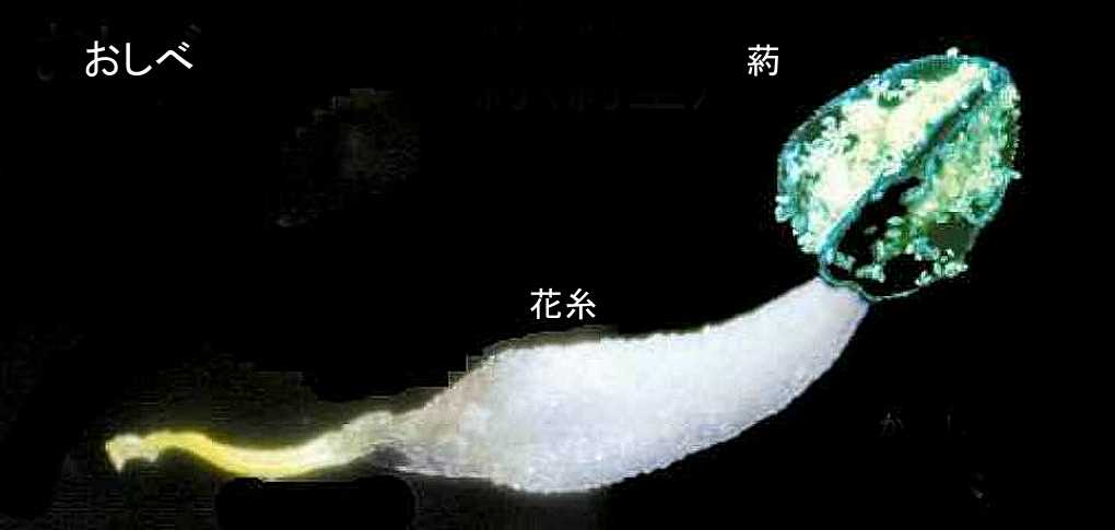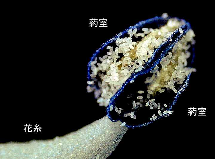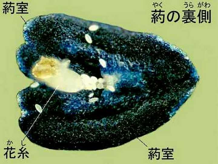 葯のうらがわから見てみました。 花糸が葯のまん中についているように見えますが、花糸より左側の葯室は、たがいにはなれています。 花糸からのびたところを 左の写真では、葯隔は、はっきりしませんが、やく室とやく室の接しているところと考えればいいでしょう。 |