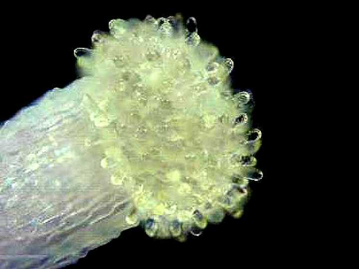 柱頭は、花粉をつかまえるところです。 そのためには、いくつかの工夫があります。 その1つとして、細かい 左の写真の柱頭は、開花前の花粉がついていない状態のものです。 柱頭からは、 これなら花粉がくっつきやすいですね。 |