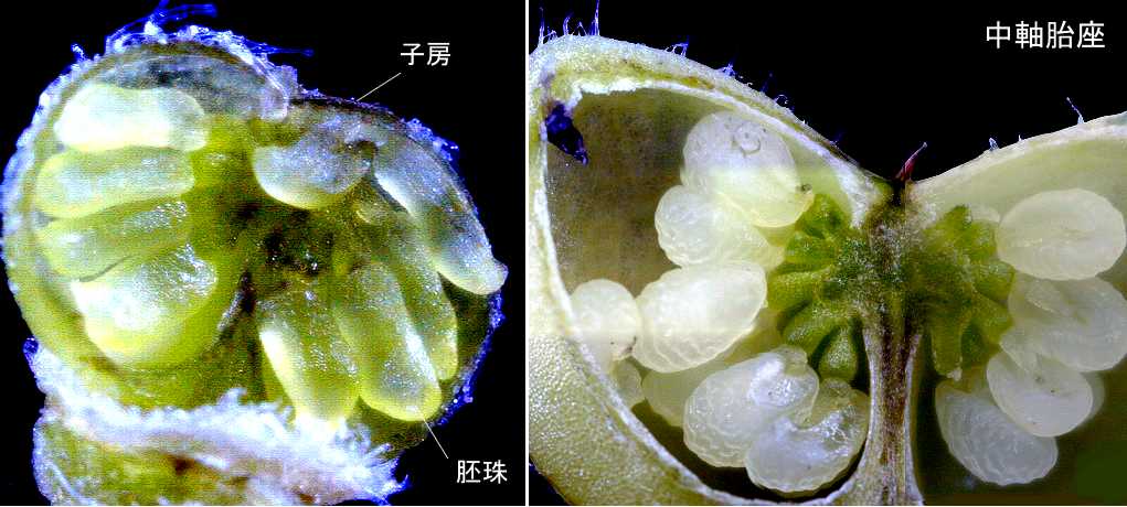 子房の中には、中央に 胚珠がつくところを 子房は成長すると果実になります。 左の写真は子房で、右はだいぶ果実に近づいていますが、まだ果実とはいえませんね。 |