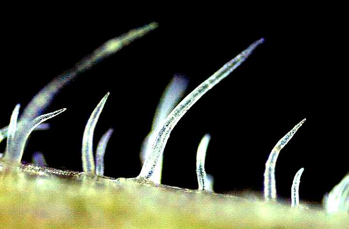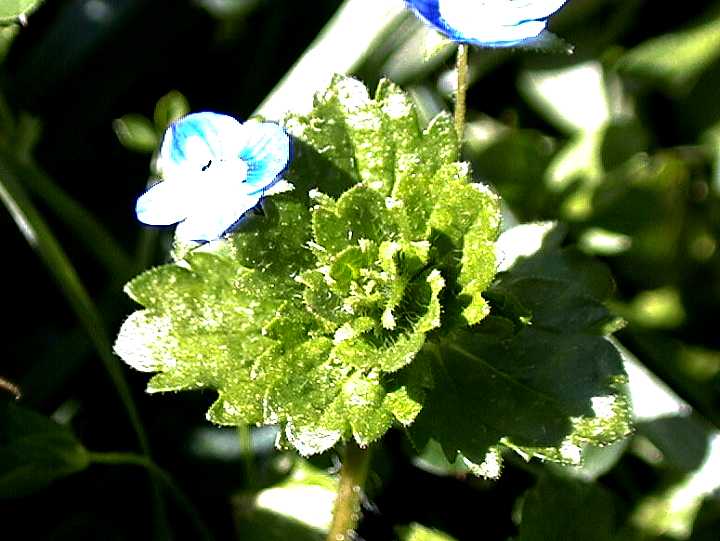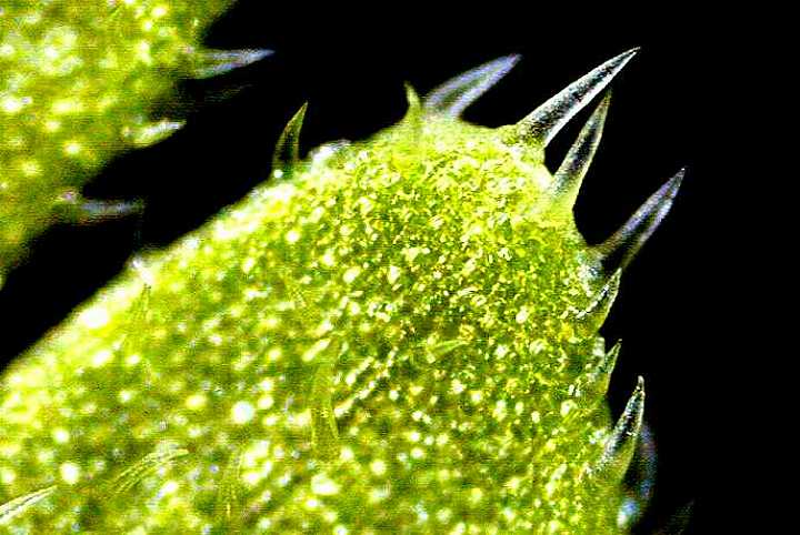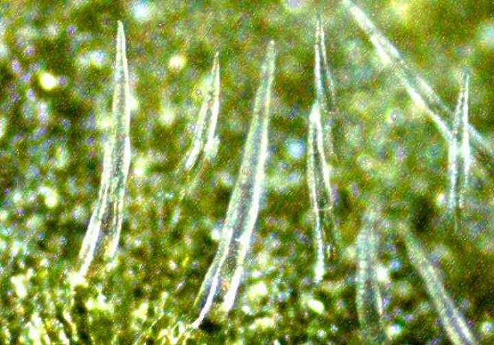 葉をアップしてみます。 左の写真は、葉の鋸歯の部分です。 顕微鏡で見ているのでするどいトゲのように見えますが、、実際には、するどくはないただの毛なんです。 オオイヌノフグリは、毛が多く、いたるところに生えています。 |