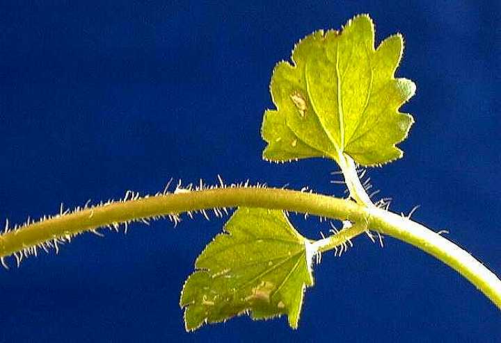 これは、茎の毛です。 オオイヌノフグリは、茎にも毛が生えているのです。 茎の毛のほうが、葉の毛よりちょっとばかり長いようです。 |