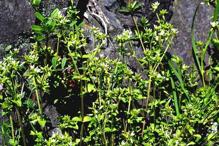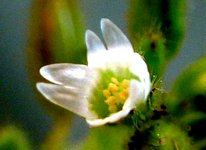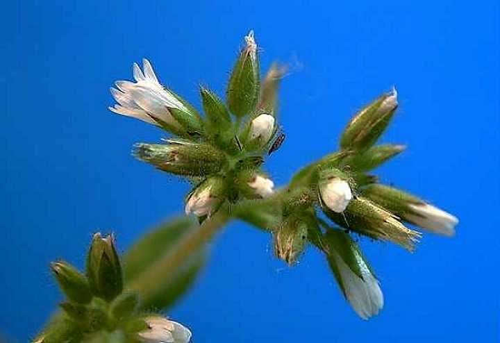 花弁は大きく裂けているから全部で10枚のように見えますが、ほんとうは5枚です。 ナデシコ科の中でも、ハコベ属とミミナグサ属にこのような花被が多いようです。 ノミノツヅリ属のノミノツヅリのようにまったく裂けていないものもあります。 |