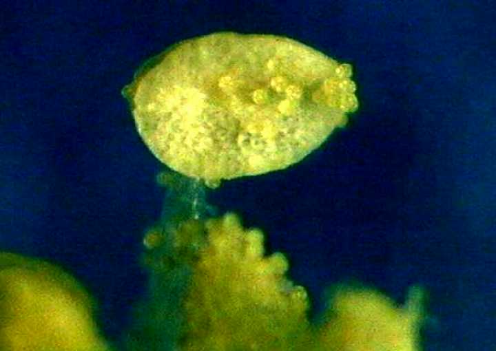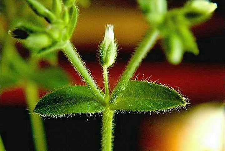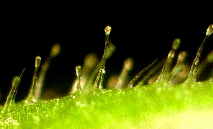 植物に生えている毛は、顕微鏡で観察すると、なかなかおもしろいものです。 植物の種類によっていろいろな形を見ることができます。 オランダミミナグサの茎の毛は、綿棒のような形をしています。 中にはとがったものもありますね。 まるい頭からは、粘液が出ます。この粘液は、たいていが害虫よけのようです。 |