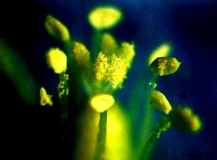 おしべを拡大してみます。 葯は、 花糸というのは、おしべの棒の部分です。 写真の葯室は、完全に(180度)開いています。向こう側にも、もう1つの葯室があるはずです。 葯室は、花粉をつくるところです。 2個の葯室が葯隔をはさんで背中合わせについています。 |