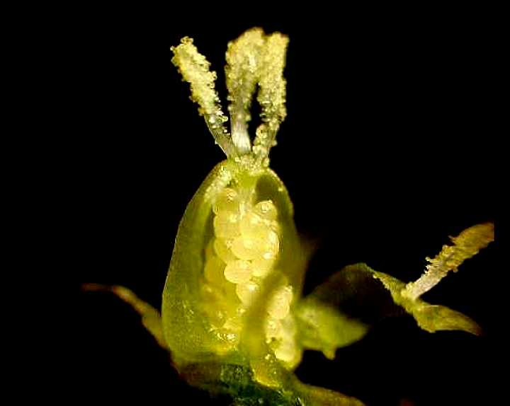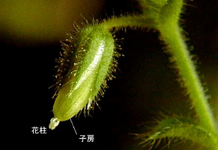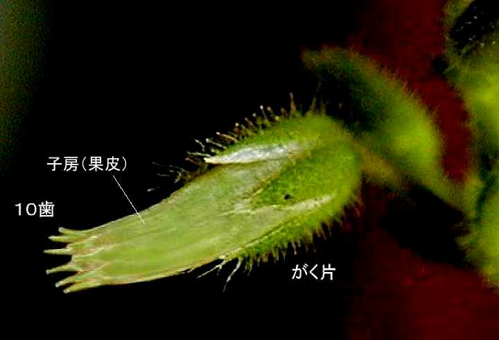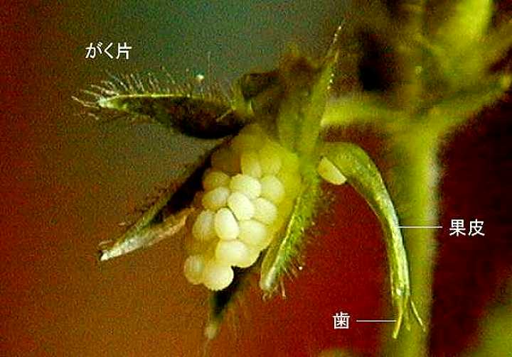 花が終わると、花弁がしおれてとれてしまいます。 子房がふくらんできて、がくより長くなります。 がくにも茎にも毛がびっしり生えています。 子房が成長すると(熟すと)果実になります。 中に入っている胚珠が種子に成長しています。 |