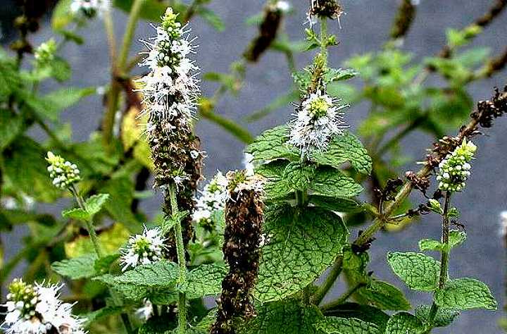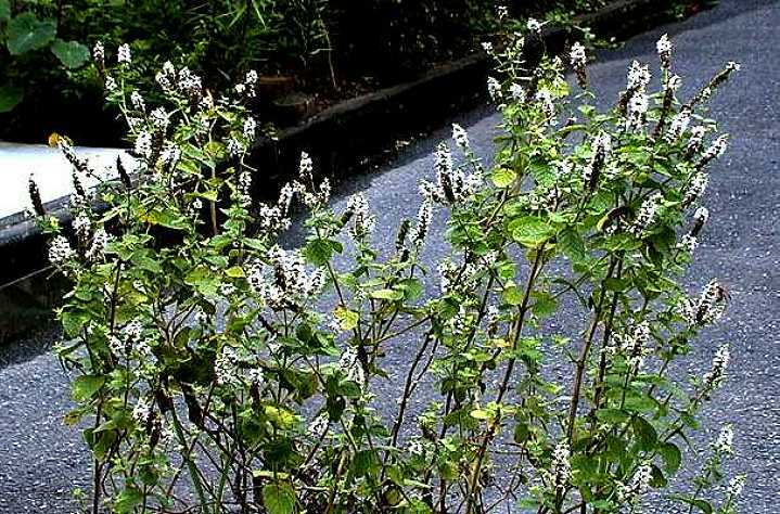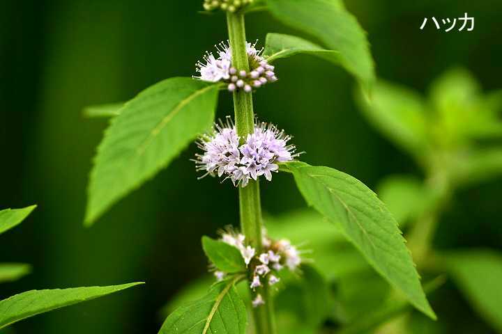 葉の オランダハッカは、帰化植物です。 もともとは江戸時代に導入された ヨウシュハッカは、ペパーミントと呼ばれ、オランダハッカを含むミドリハッカのなかまをスペアミントと呼んでいます。 帰化植物ではない日本のハッカもあります。和名はただのハッカです。外国の安いハッカに押され、現在では、あまり栽培されていないようです。 |