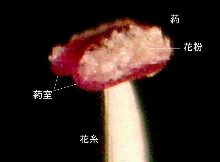 おしべは、 葯は2個の葯室が平行に並んでいます。 2個の葯室は、花糸の 写真では葯室が開いている状態で、花粉があふれそうです。 |