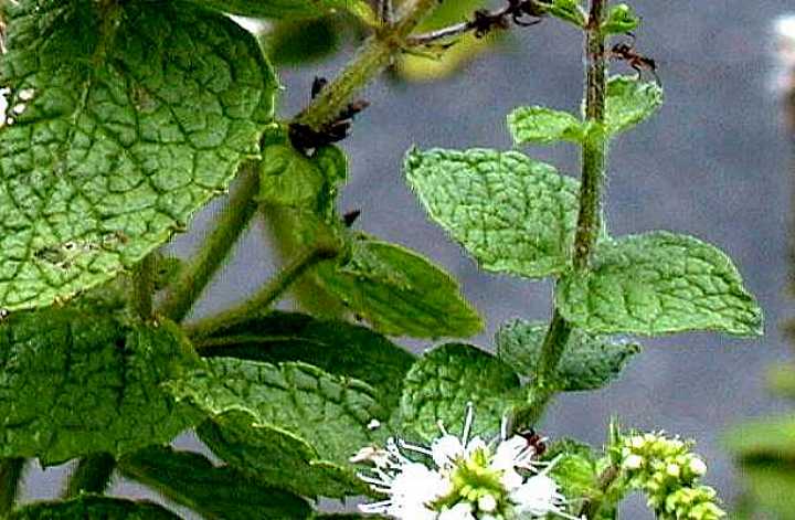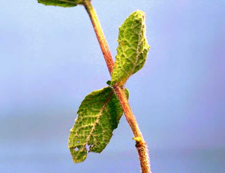 茎には毛が生えており、切り口は、シソ科特有の四角です。 葉は、シソとアジサイを足したような感じがします。ハッカ属の中では、葉脈のでこぼこが特に大きく、ちぢれた感じがします。 葉のつきかたは、互いに向かい合ってついているから |