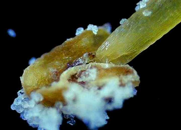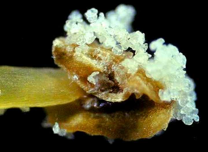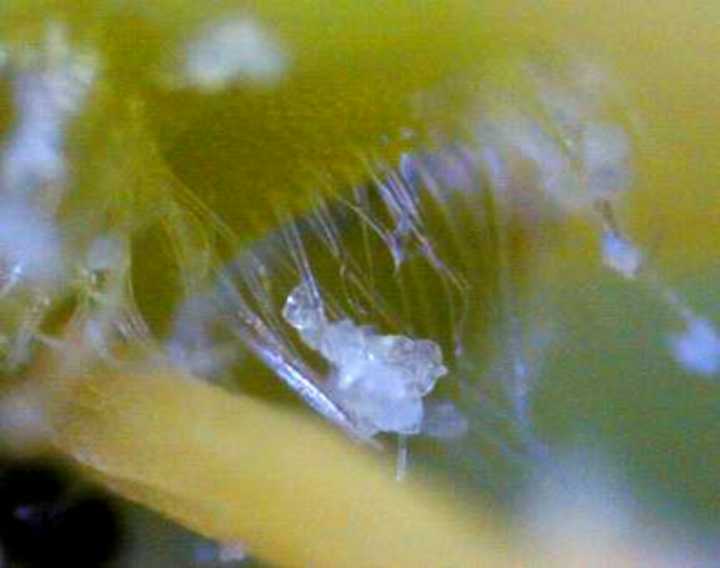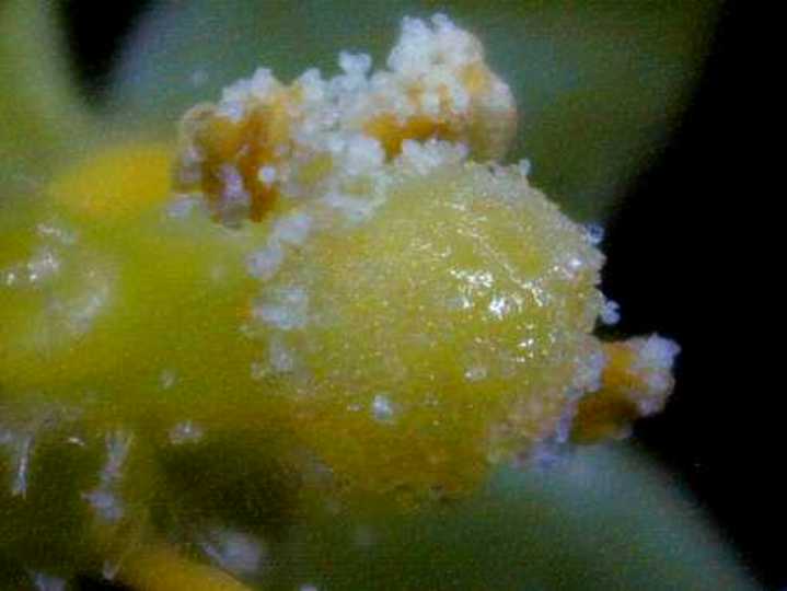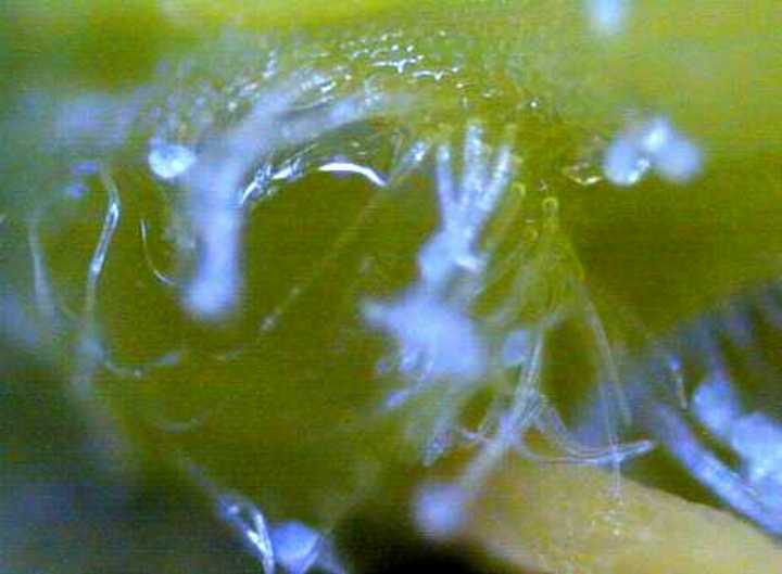 蜜腺の1つをとらえました。 光っているのは、蜜を出しているからです。 この蜜をめざして昆虫がよってきます。 |