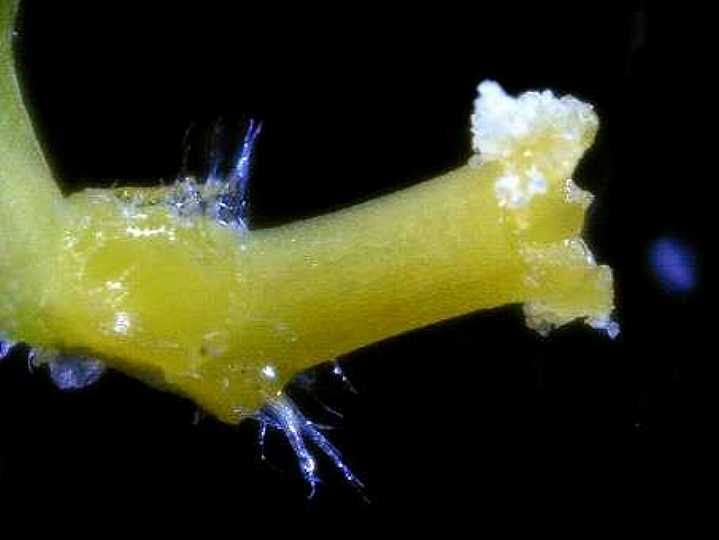 柱頭の表面を実体顕微鏡で拡大してみました。 無数のつぶつぶ状の突起がありました。それなりに進化しているようですが、マツヨイグサ属のような優れた進化にはなっていないようです。 |