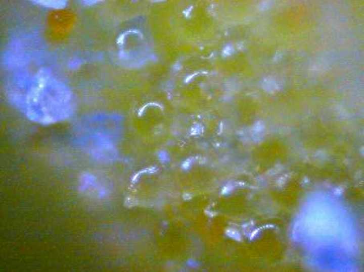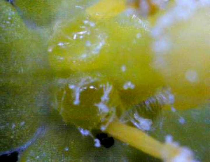 めしべやおしべのつけねのところを顕微鏡で観察してみます。 緑色のかたまり(粒)が見えます。 見なれてくるとすぐわかるようになりますが、これは蜜腺です。 蜜腺というのは、蜜を出すところです。 虫媒花の中には、昆虫を呼ぶために蜜を出すものが少なくありません。 |