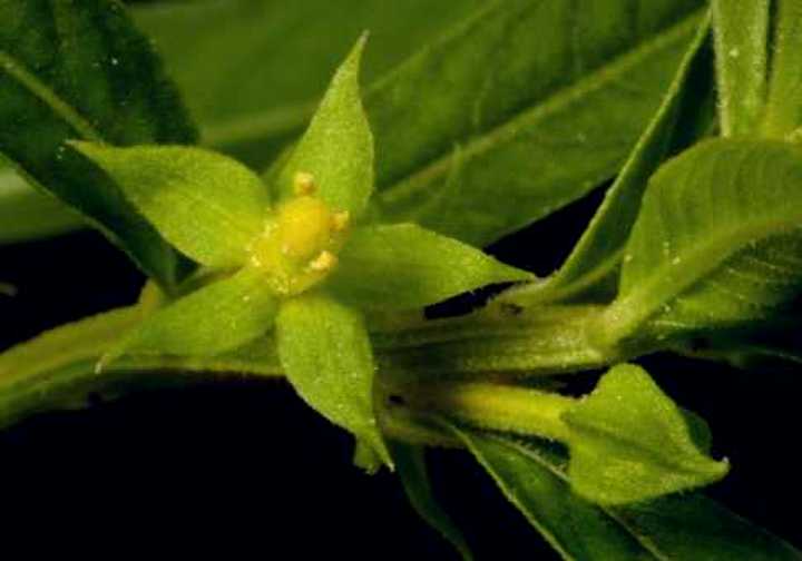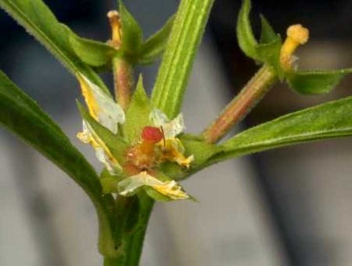 アカバナ科ですから4枚の花弁が基本ですが、チョウジタデのなかまは5枚のものがかなりあります。 花弁が5枚だと、がくやおしべの数も5になります。もちろん子房の中も5室になります。 |
